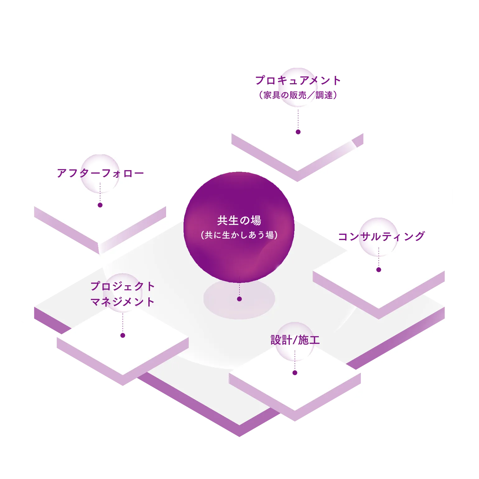 それぞれの企業・チームが持つ「らしさ」を大切にしながらパフォーマンスを最大化する「共生」を考え、WSIの各領域の専門性を生かして最適な「場」を構築します。