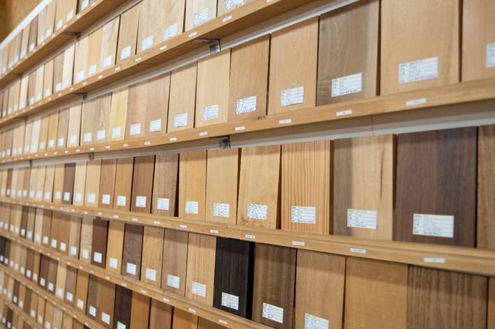 森から伐採されて原木置き場まで運ばれてきた状態を見にいくことが多いです。あるいは市場に行って競りに参加することもあります。その際にどこを見極めるかと言うと、木の表面全部。丸太の外側、皮の部分、カットされた切り口の年輪、全部見ます。見ながら、どういう日当たりの場所でどんなスピードで育ったか、北側か南側か、斜面に生えていたかなどの生育歴を読み解いていきます。例えば日当たりのいい場所で急速に育った木は、枝葉を増やして盛んに光合成をしてきたため、節が多く、質もあまり良くない。逆に日当たりの悪い場所だとゆっくりゆっくり育ち、年輪も緻密になる。屋久杉がいい例ですね、100年で10センチしか育たないからこそしっかりした木になります。ただ、中には木の節が好きな人もいますので、一概に欠点とは言えません。よって、節があるからといって一律に排除せず、「何に使えるか」「どなたが買ってくれるか」という売り先を思い浮かべながら買い付けをしています。過去に一度でも「◯◯という木はありますか?」と問い合わせを受けたものは、全て揃えてやろうという気概でいたら、今は常時250種類の木をストックしておくようになりました。