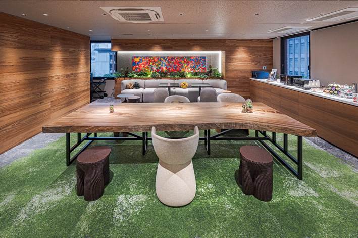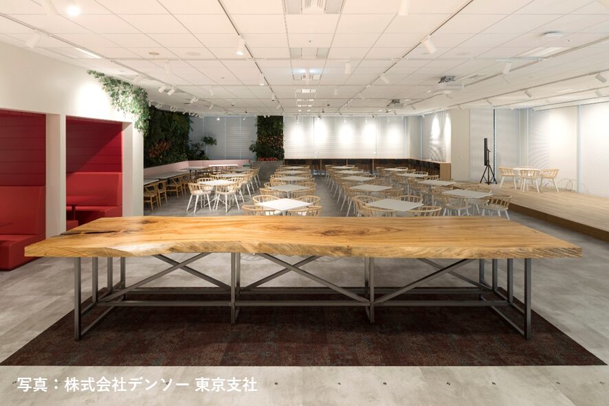 以前デンソーさんのオフィスリニューアルを行った際に、長さ4mものクスノキの一枚板のテーブルを入れましたよね。あれも新しい東京オフィスにデンソーを象徴するようなシンボリックなものを置きたいという思いから、皆で議論をする中で、クスノキがデンソー本社のある愛知県刈谷市の“市木”であることに着目して、そこにさらに「東京という地で大きく育ってほしい」という願いを重ねて。高田さんにはそうした思いにぴったりの木材を目利きしていただきました。あのテーブルは今、デンソー新虎オフィスの象徴的な存在として、皆が集うエリアに置かれています。これがもう、大変ご好評で!